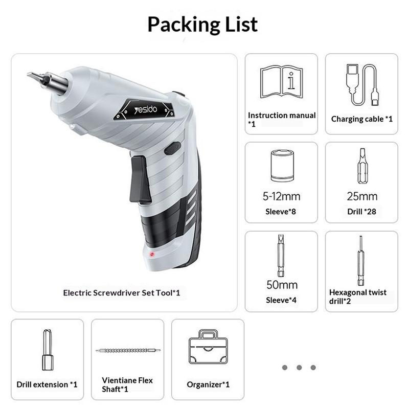 Yesido EC34 Cordless Electric Screwdriver Kit - Dual Purpose Straight and Gun Type Repair Tool with LED Light