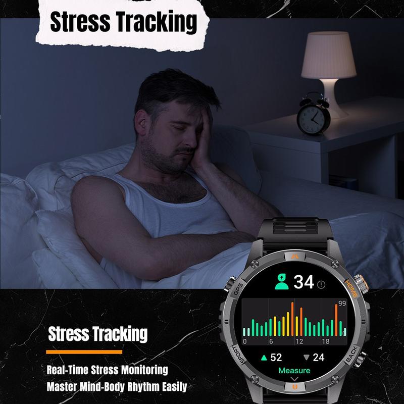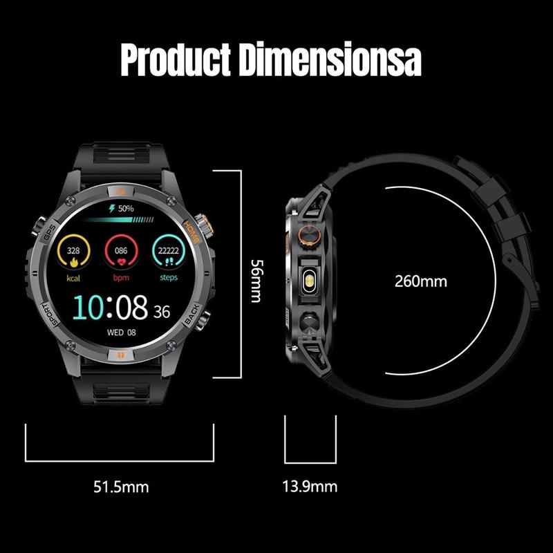 Designed for outdoor adventures, the watch features a built-in flashlight, GPS positioning and a digital compass, helping you navigate trails and track your routes with confidence. Its 580 mAh high-capacity battery offers long-lasting performance, delivering up to 40 days of standby time and approximately 7 days of regular use. With an IP68 waterproof rating, it withstands rain, splashes and swimming without worry.