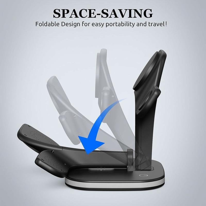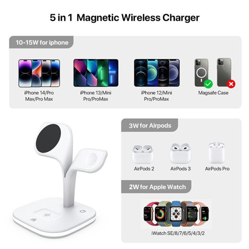 - 15W Fast Charging with MagSafe Compatibility: Aligned with MagSafe charging magnets, the charger delivers faster and safer wireless charging. It rapidly charges iPhone 17, 16, 15, 14, 13, and 12 series (Pro/Pro Max/Mini/Plus) from 0 to 80% in about 1.5 hours, while simultaneously powering Apple Watch Series 1-10/Ultra/SE and AirPods 2/3 Pro/Pro 2.