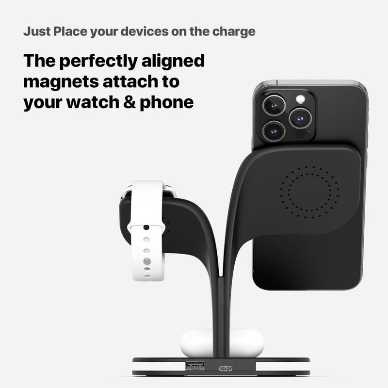 - 3-in-1 Wireless Charging: Equipped with two built-in charging pads compatible with MagSafe, this station allows for simultaneous charging of your iPhone, Apple Watch, and AirPods, streamlining your charging needs.