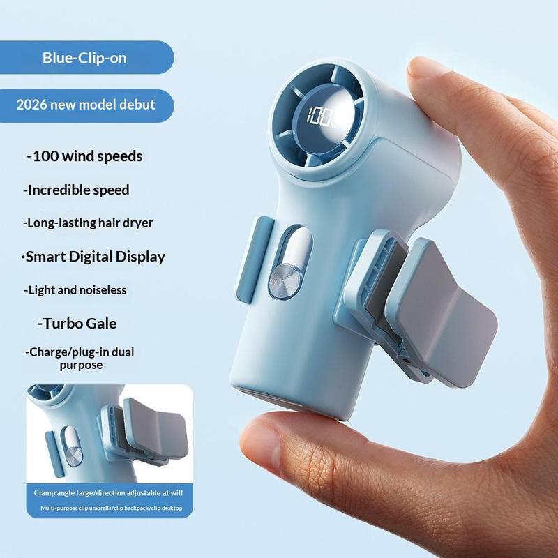 - Mini rechargeable fan for handheld, desktop, and clip-on use