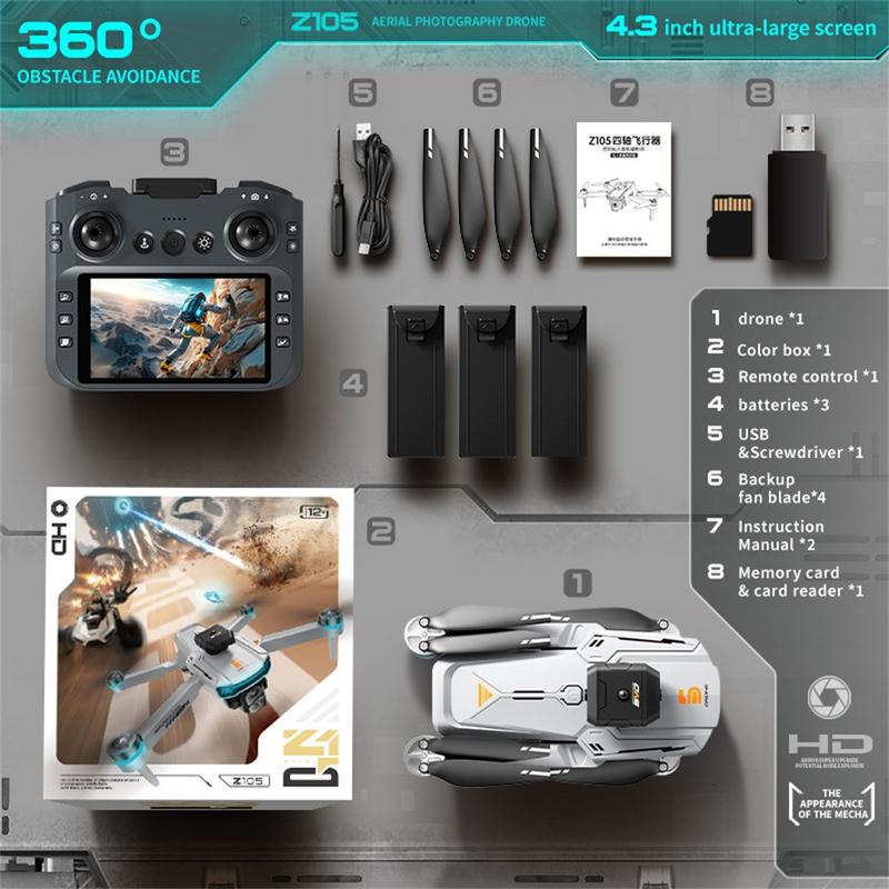 Z105 Dual-Camera Smart Drone with 4.3" Display Controller & 3 Batteries - Brushless Motor Obstacle Avoidance Quadcopter
